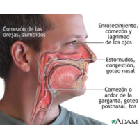 Inflamación y congestión del revestimiento mucoso de la nariz. Produce insuficiencia respiratoria nasal, picazón, moco acuoso y estornudos. Puede dar lugar a estados de irritabilidad y trastornos del sueño.