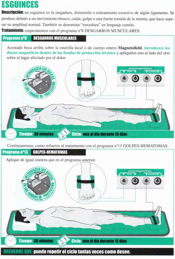 La Terapia con Magnetofield actúa sobre dolores articulares y musculares con rápido alivio del dolor; sobre el agotamiento físico, aumentando la energía vital y ayuda al organismo a regenerarse, estimulando la capacidad reparadora del tejido lesionado. Los deportistas de élite la están usando por ser un complemento efectivo natural, ya que no intoxica al organismo, a diferencia de las terapias farmacológicas.