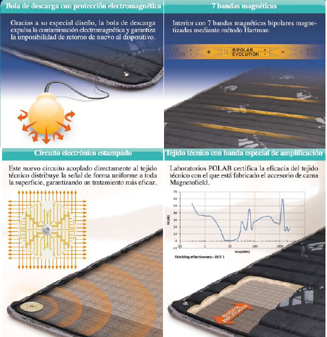 - DESCARGA ELECTROMAGNÉTICA: El accesorio de cama Magnetofield absorbe de nuestro cuerpo y expulsa toda la contaminación electromagnética acumulada durante el día mediante la bola de descarga a tierra.