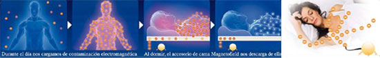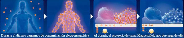 - PROTECCIÓN: Durante el descanso nuestro cuerpo es especialmente vulnerable. Al dormir sobre el accesorio de terapia nocturna Magnetofield, estamos protegidos de la contaminación electromagnética que se encuentra cerca de nuestra cama, como lámparas, despertadores eléctricos, enchufes, TV, aire acondicionado, etc.