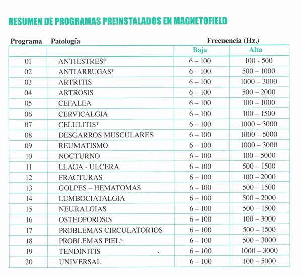 Estos programas están grabados en el software del dispositivo y, al seleccionar uno de ellos, Magnetofield selecciona automáticamente la frecuencia en baja, la frecuencia en alta, la intensidad del campo magnético, la forma de onda, el tiempo de pulso y la duración de la terapia (todos los programas del 1 al 19 duran 30 minutos- tiempo mínimo recomendado por el fabricante- no obstante, nosotros le asesoraremos según a usted le convenga; el programa 20 Universal es tiempo contínuo).