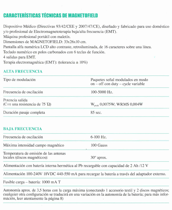 - Para todas las terapias, Magnetofield emite un campo magnético a baja frecuencia: 6-100 hz.