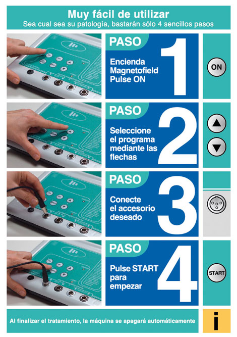 Magnetofield es extremadamente rápido y sencillo de poner en marcha; para comenzar cualquier terapia, simplemente basta con seguir, siempre, 4 sencillos pasos: