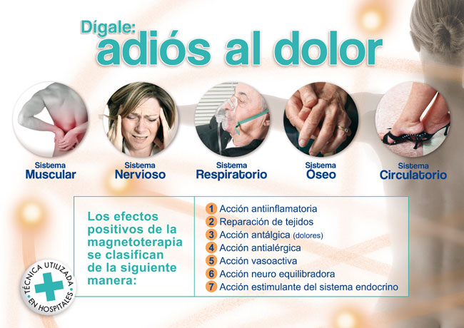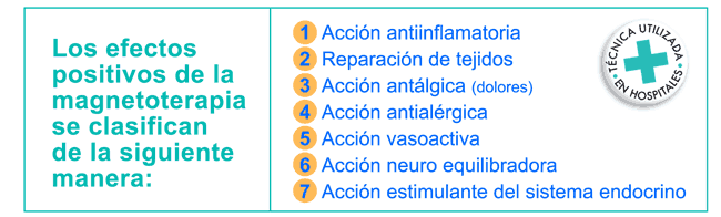 - Acción magneto eléctrica: cambios iónicos a nivel de las membranas celulares, incremento de la utilización de oxigeno y recuperación del potencial de la membrana celular.