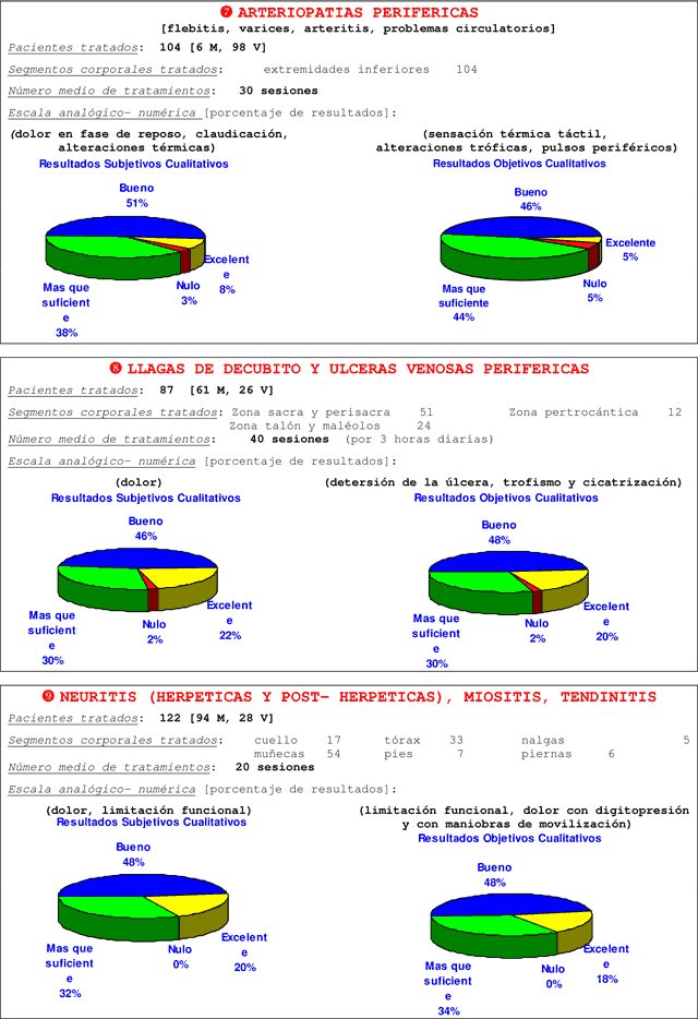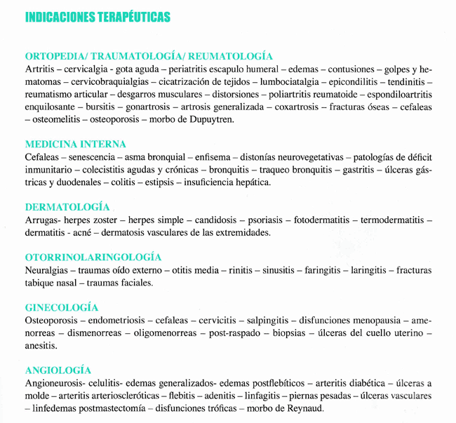 - En algunos casos, durante las primeras aplicaciones se puede percibir una agudización del dolor, llamado efecto balneario, sobre todo si estamos aplicando el tratamiento en un punto inflamado o postraumático (tendinitis, cervicalgia, artrosis, esguinces, etc). Si el dolor fuese molesto o muy agudo se recomienda interrumpir momentáneamente durante 1 ó 2 días el tratamiento para después reiniciarlo. El paciente debe saber que el efecto de agudización es una reacción positiva del organismo al tratamiento recibido.