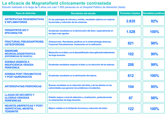 - Magnetofield es el único dispositivo de Magnetoterapia que ha sido testado por médicos y científicos, antes de su comercialización, en uno de los estudios más amplios que jamás se han realizado con pacientes de un hospital público, para comprobar los efectos de la magnetoterapia en diferentes patologías. En concreto, el estudio se realizó durante 5 años a 7000 pacientes. Vea la sección de nuestra Web, 3. Eficacia de Magnetofield, estudio de Manerbio.