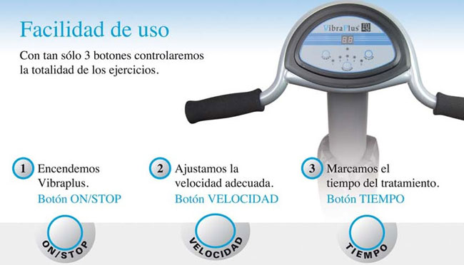 nuestro propio domicilio o trabajo, obtendremos una serie de beneficios ampliamente contrastados. VIBRAPLUS se sirve con un manual explicativo de dichos ejercicios y la aplicación particular, en cada caso.